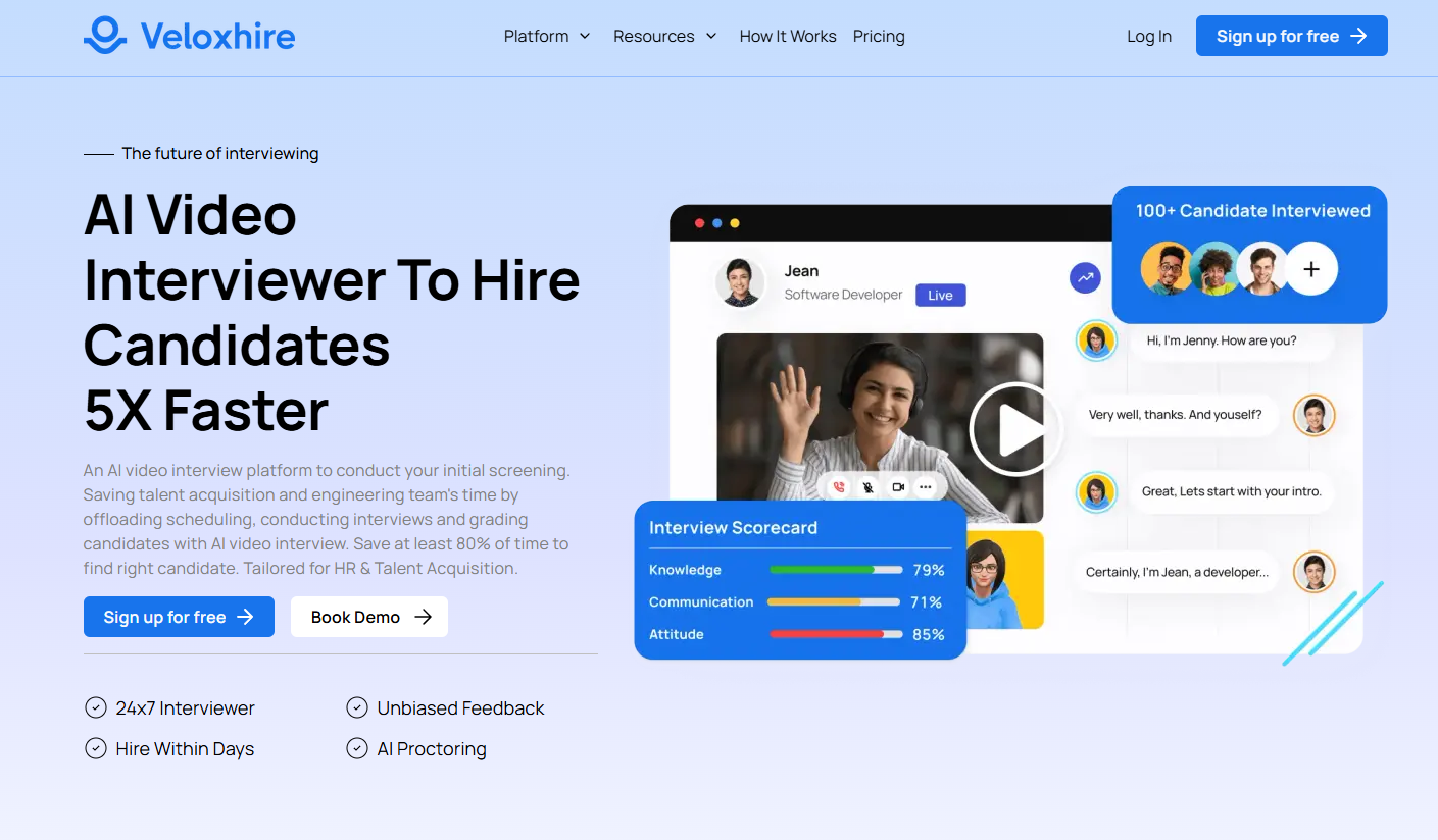 Veloxhire is an AI-powered video interviewing platform that automates first-round candidate evaluations, helping hiring teams quickly identify top talent. The software conducts realistic, human-like interviews and adapts follow-up questions to evaluate technical skills and problem-solving abilities. By automating early-stage screening, Veloxhire reduces the time spent on manual assessments while ensuring fair and consistent evaluations. With flexible scheduling and 24/7 availability, the platform enables teams to accelerate hiring decisions without sacrificing quality or depth.