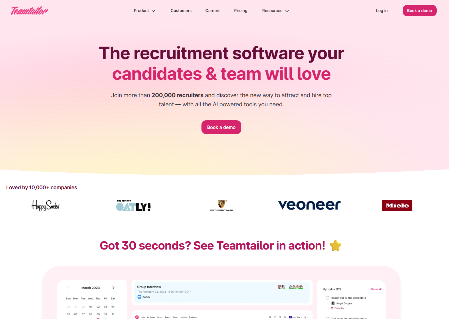 Teamtailor improves candidate experience while centralizing collaboration. Its generative AI assistant helps with job posts, interview questions, and candidate communication.